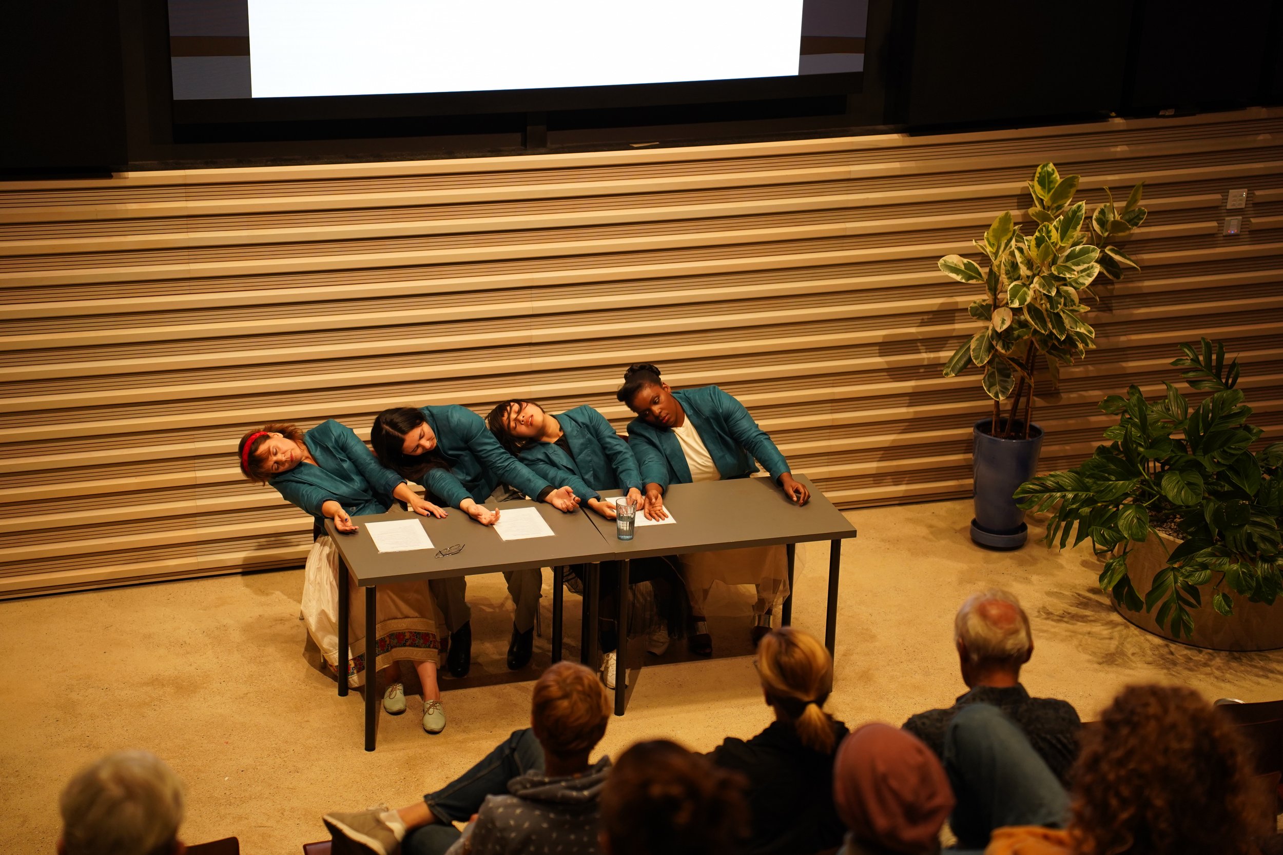 In der vierten ästhetischen Auseinandersetzung mit der kulturellen und politischen Bedeutung von Wasser war das Setting die Stunde vor einer fiktiven Wasserkonferenz. Der Moment, wenn Mikros vermeintlich aus sind. Die Figuren, die unter der Vorgabe der Frage: “Ist Wasser ein Menschenrecht?” gemeinsam entwickelt wurden, waren vier Expertinnen.