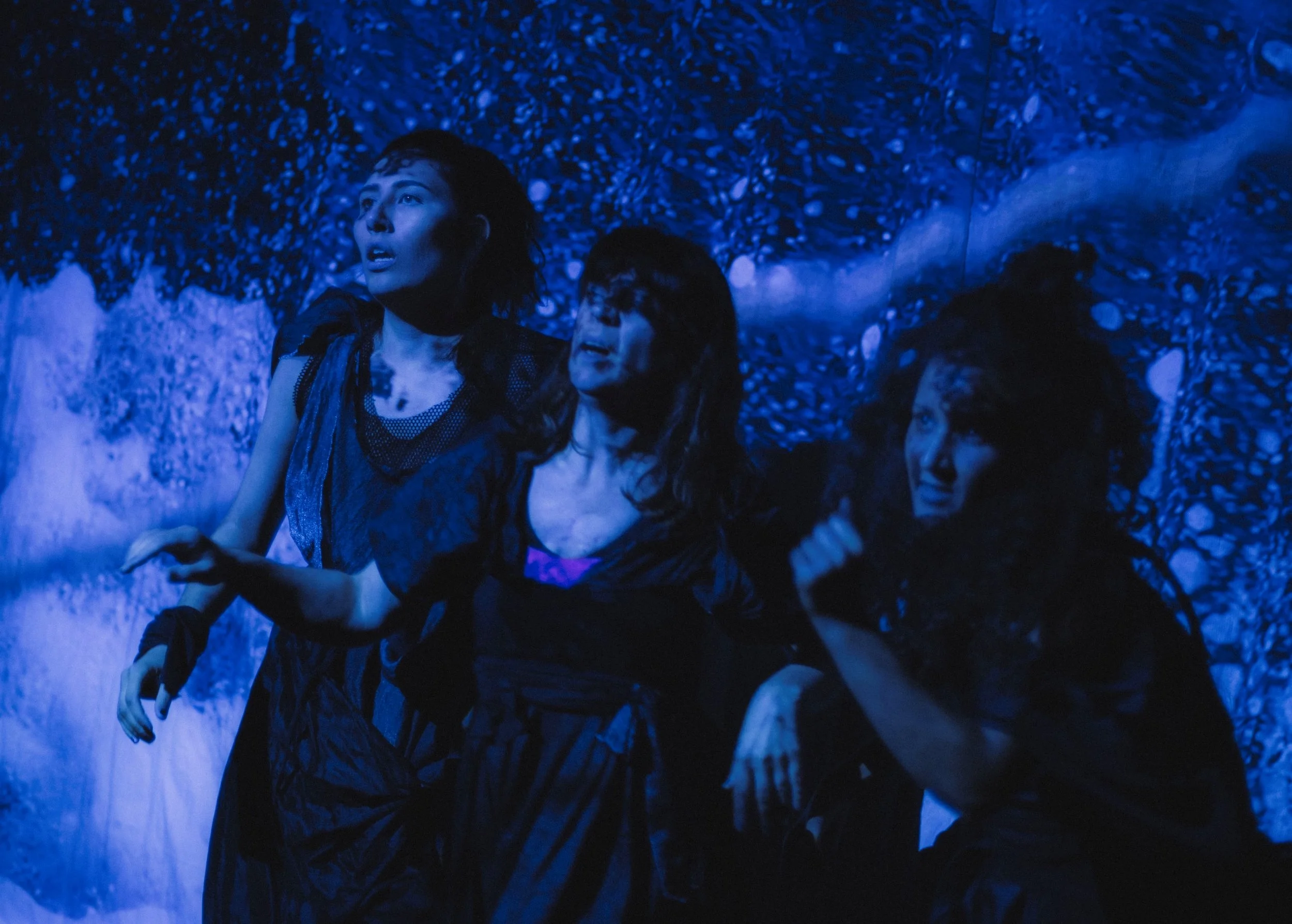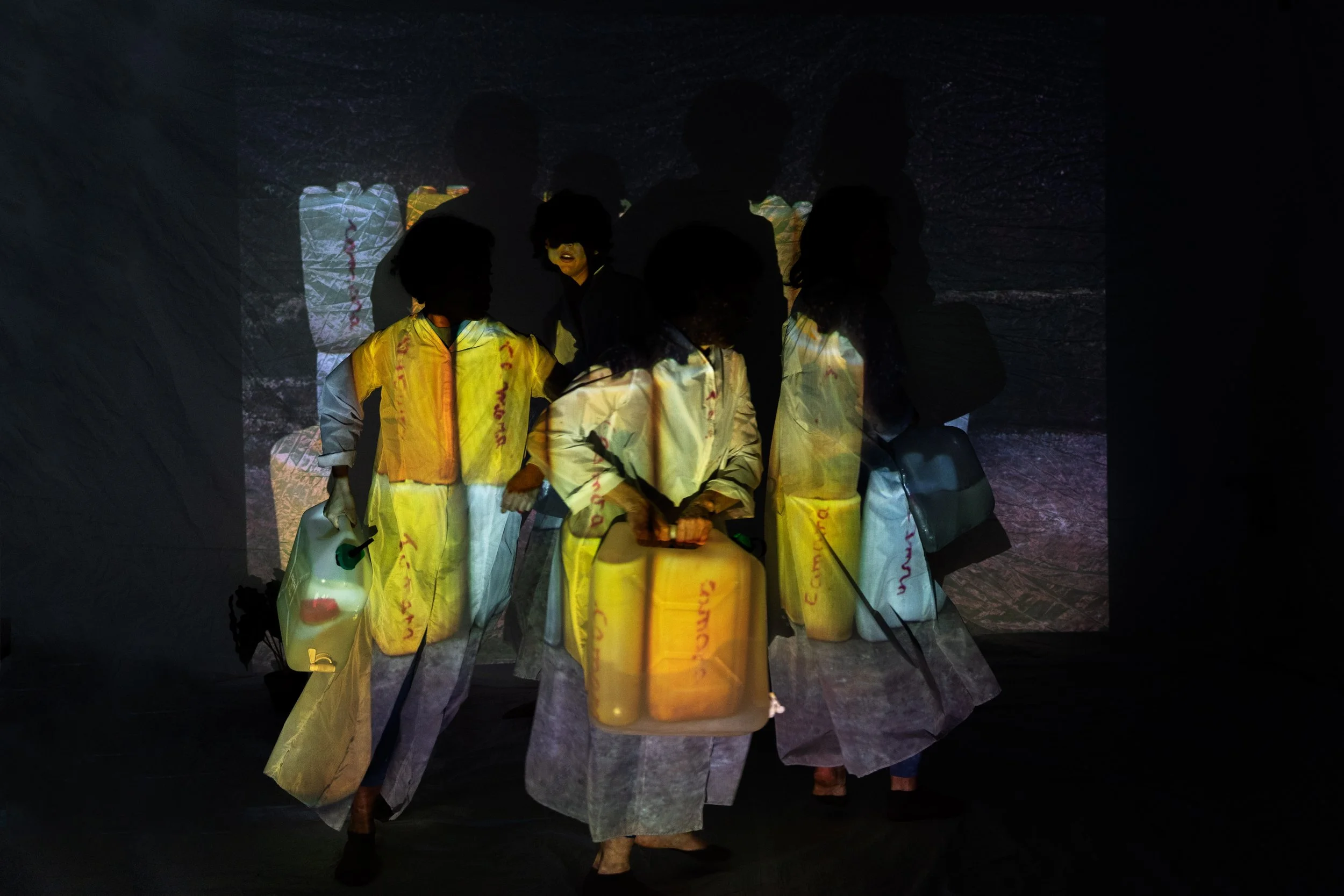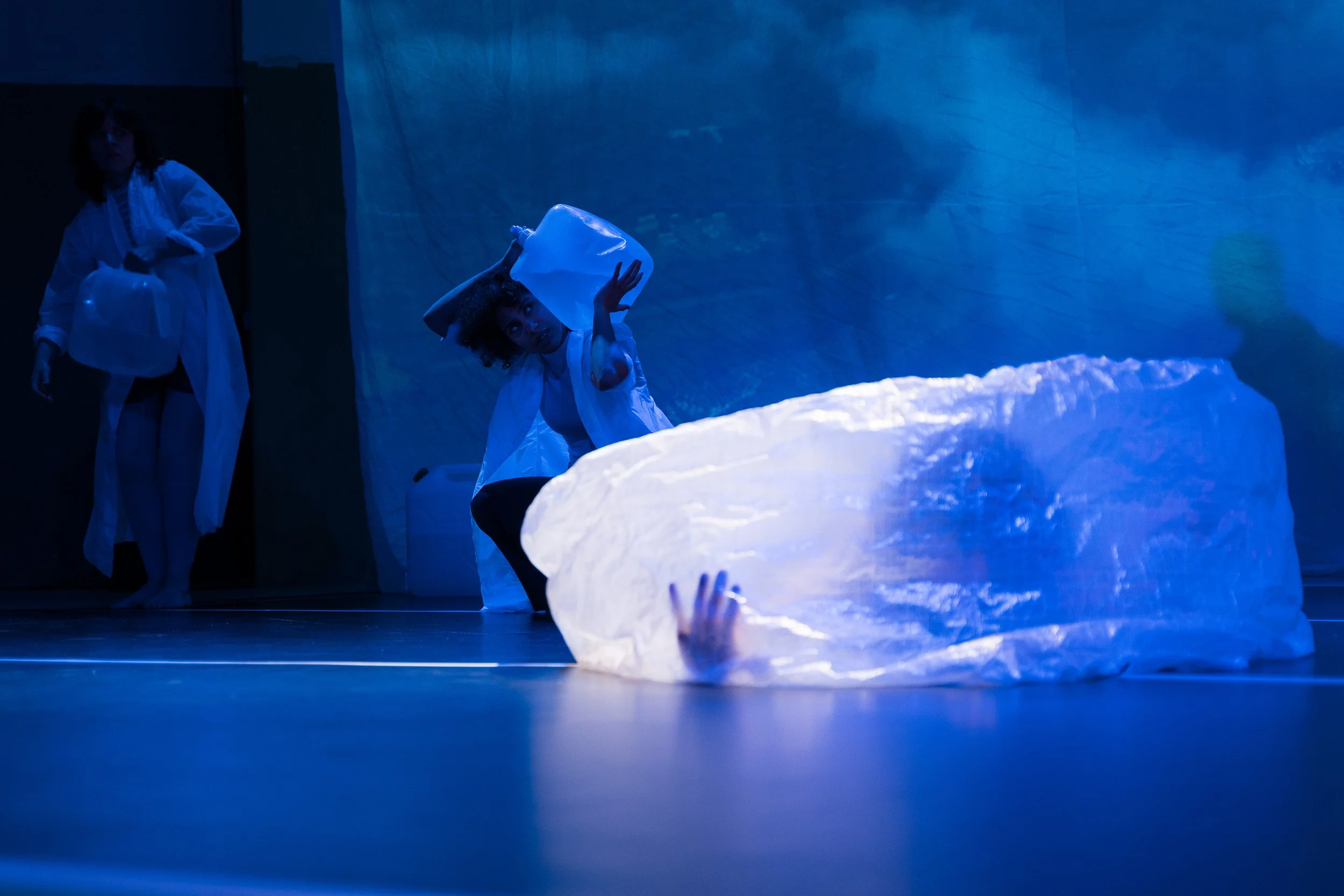 Der Klang der eindrücklichen Worte der Klima-Aktivistin E. Wathuti aus Kenia eröffnet das Geschehen. Ihr Appell „Open your hearts and then act“ bei der COP 26 war der Ausgangspunkt der inhaltlichen Entwicklung des Tanztheaterstücks. Die ästhetische Arbeit bewegt sich erneut an der Schnittstelle von Performance, Nachhaltigkeit und Gerechtigkeit und erkundet mit Objekten die kulturelle und politische Bedeutung von Wasser.